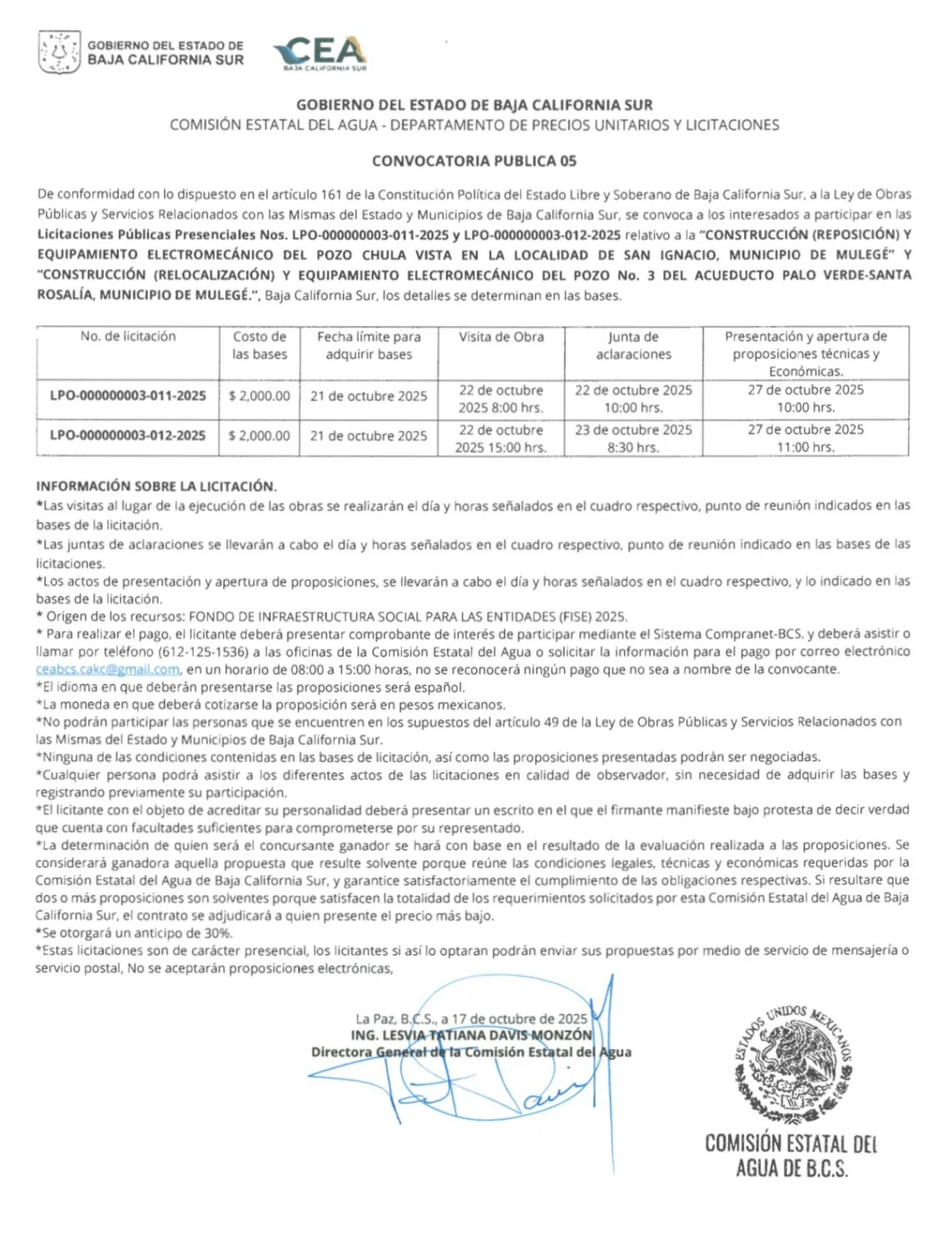 De conformidad con lo dispuesto en el artículo 161 de la Constitución Política del Estado Libre y Soberano de Baja California Sur, a la Ley de Obras Públicas y Servicios Relacionados con las Mismas del Estado y Municipios de Baja California Sur, se convoca a los interesados a participar en las Licitaciones Públicas Presenciales Nos. LPO-000000003-011-2025 y LPO-000000003-012-2025 relativo a la “CONSTRUCCIÓN (REPOSICIÓN) Y EQUIPAMIENTO ELECTROMECÁNICO DEL POZO CHULA VISTA EN LA LOCALIDAD DE SAN IGNACIO, MUNICIPIO DE MULEGÉ” Y “CONSTRUCCIÓN (RELOCALIZACIÓN) Y EQUIPAMIENTO ELECTROMECÁNICO DEL POZO No. 3 DEL ACUEDUCTO PALO VERDE-SANTA ROSALÍA, MUNICIPIO DE MULEGÉ.”, Baja California Sur, los detalles se determinan en las bases.